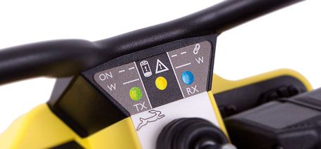 Die LEDs an dem Sender zeigen den Betriebszustand, Akku-Leermeldung und Störmeldungen der Funkfernsteuerung an. Weitere LEDs können als Rückmeldung, um Zustände der Maschine anzuzeigen, vorgesehen werden.