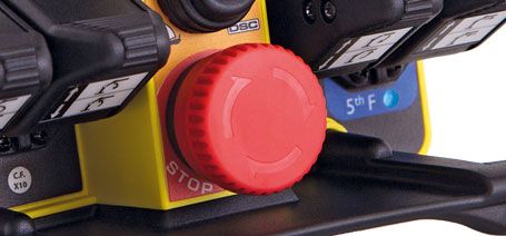 Der pilzförmigen Not-Halt-Schalter gewährleistet einen maximalen Grad an Sicherheit, gemäß den europäischen und internationalen Normen. Obwohl der Not-Halt Schalter optimal gegen versehentliche Stöße geschützt ist, ist er für den Bediener leicht erreichbar und nimmt eine Vorrangstellung ein.