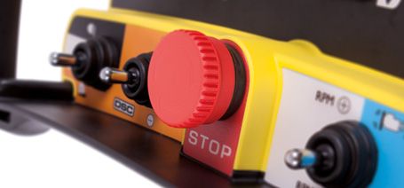 Der pilzförmigen Not-Halt-Schalter gewährleistet einen maximalen Grad an Sicherheit, gemäß den europäischen und internationalen Normen. Obwohl der Not-Halt Schalter optimal gegen versehentliche Stöße geschützt ist, ist er für den Bediener leicht erreichbar und nimmt eine Vorrangstellung ein.