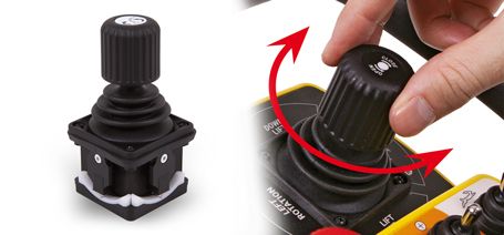 Auch die Z-Achse des dreiachsigen Joysticks basiert auf optische Auswertung. Mit der Drehachse können Schalt- oder präzise Proportionalfunktionen gesteuert werden. Wie die anderen Achsen, bietet auch die Drehachse das Sicherheitsniveau Pl d.