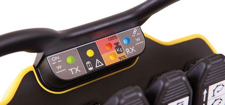 Die LEDs an dem Sender zeigen den Betriebszustand, Akku-Leermeldung und Störmeldungen der Funkfernsteuerung an. Weitere LEDs können als Rückmeldung, um Zustände der Maschine anzuzeigen, vorgesehen werden.